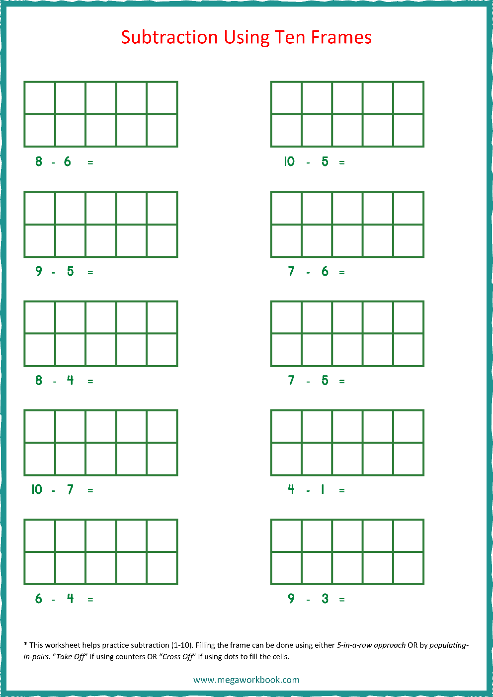 These worksheets use 10 frames, which are visual tools that help children develop a strong foundation in counting, addition, and subtraction. By using these worksheets, kids can practice recognizing numbers, understanding number relationships, and improving their mental math skills.