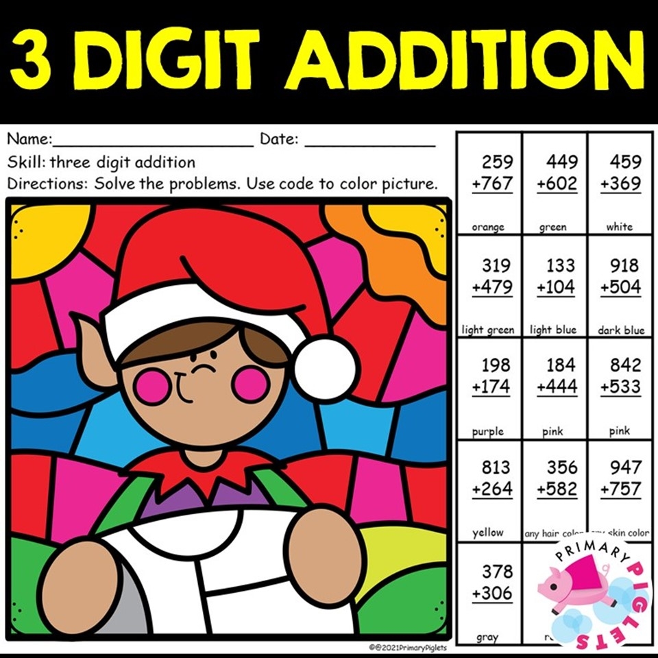 CHRISTMAS 3 DIGIT ADDITION WITH REGROUPING COLOR BY NUMBER CODE