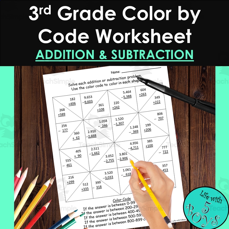3rd Grade Color By Code Math Worksheet Addition And Subtraction By Teach Simple