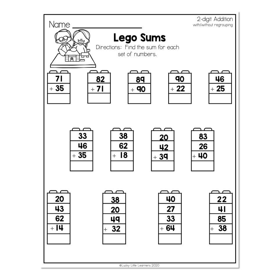 2nd Grade Math Worksheets 2 Digit Addition With Regrouping Lego Sums Lucky Little Learners