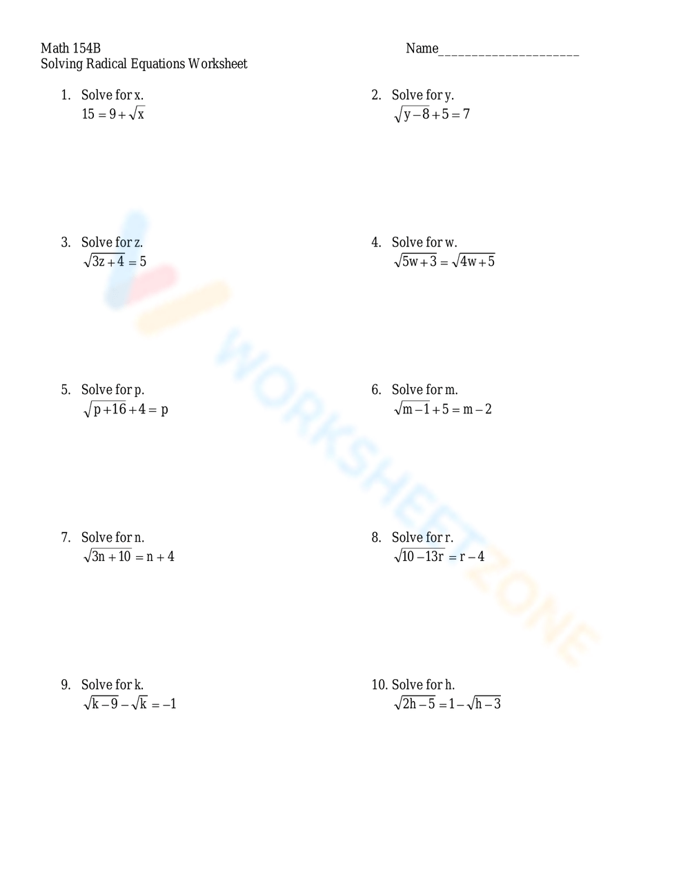 Math 154b Solving Radical Equations Worksheet