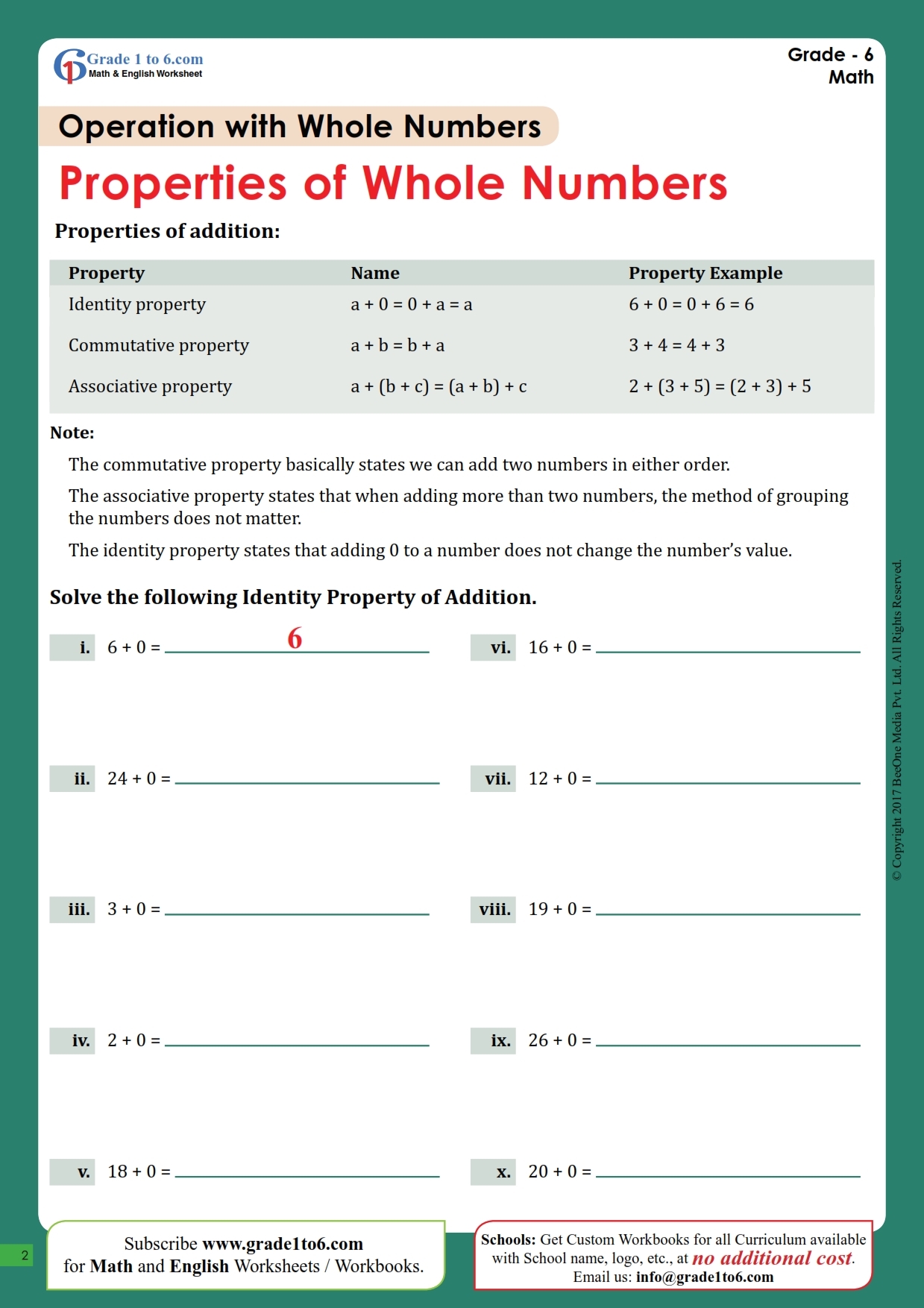 Identity Property Of Addition Worksheet Grade1to6
