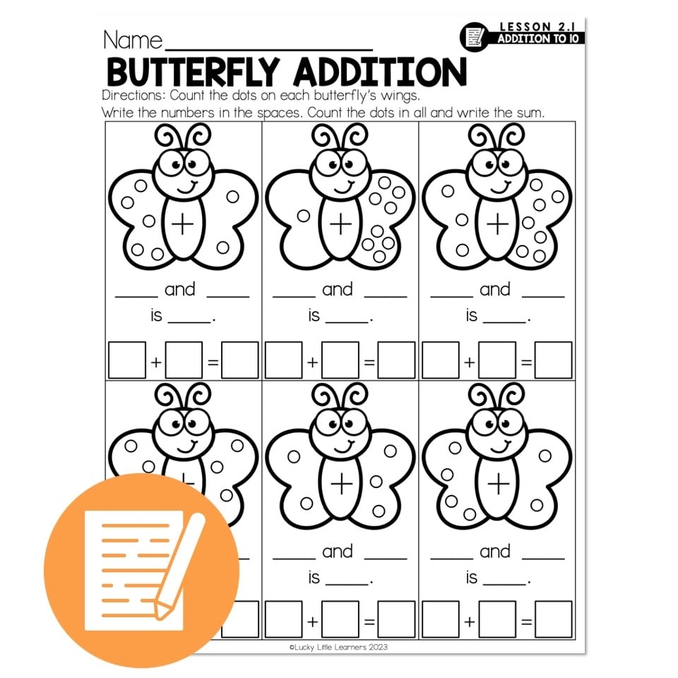 Lucky To Learn Math 1st Grade Lesson 2 1 Addition To 10 Independent Practice Butterfly Addition Lucky Little Learners