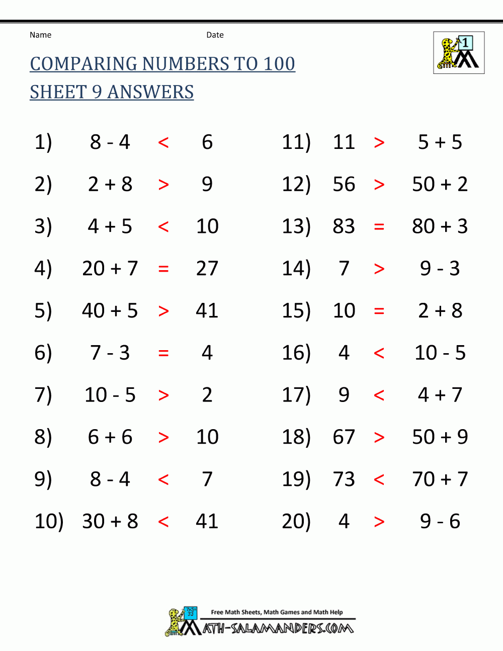 Greater Than Less Than Worksheet Comparing Numbers To 100