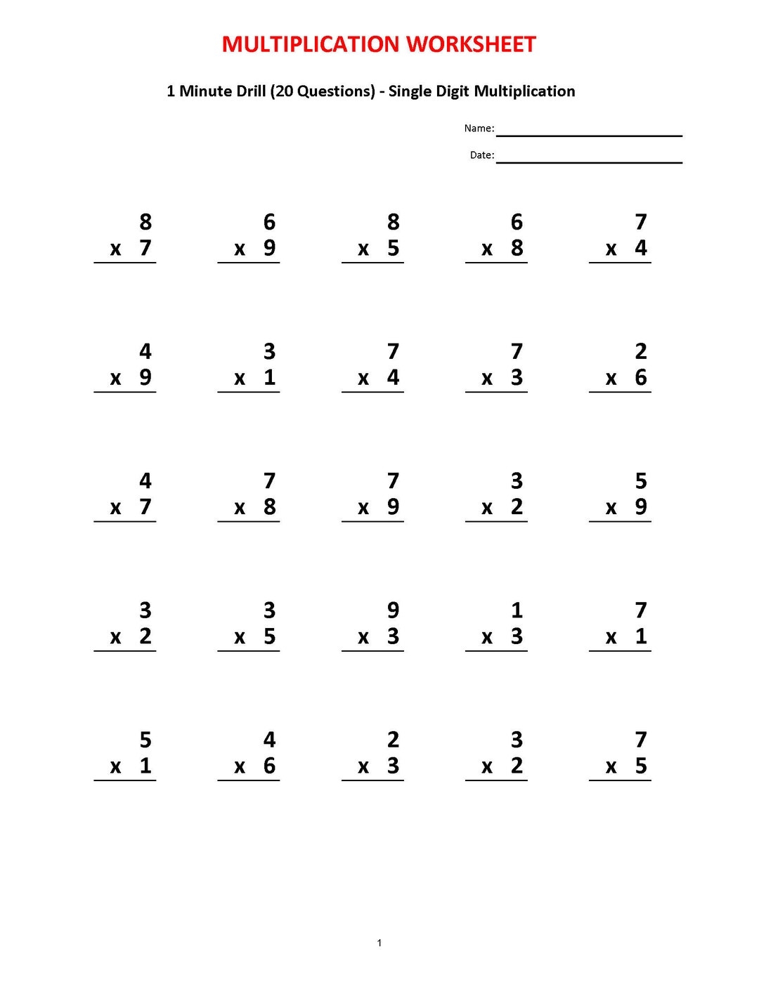 Multiplication 1 Minute Drill V 10 Math Worksheets With Answers Pdf Year 2 3 4 Grade 2 3 4 printable Worksheets Multiplication Test Etsy