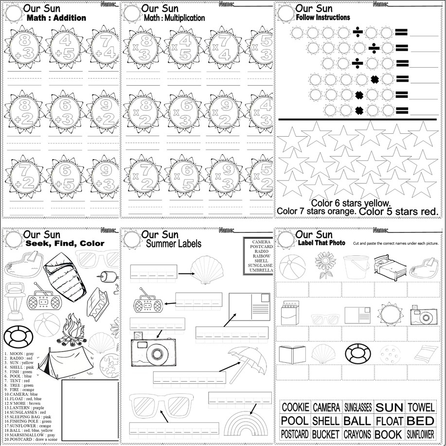 SUN Theme NO PREP Activity Worksheets Writing Vocabulary Math ELA