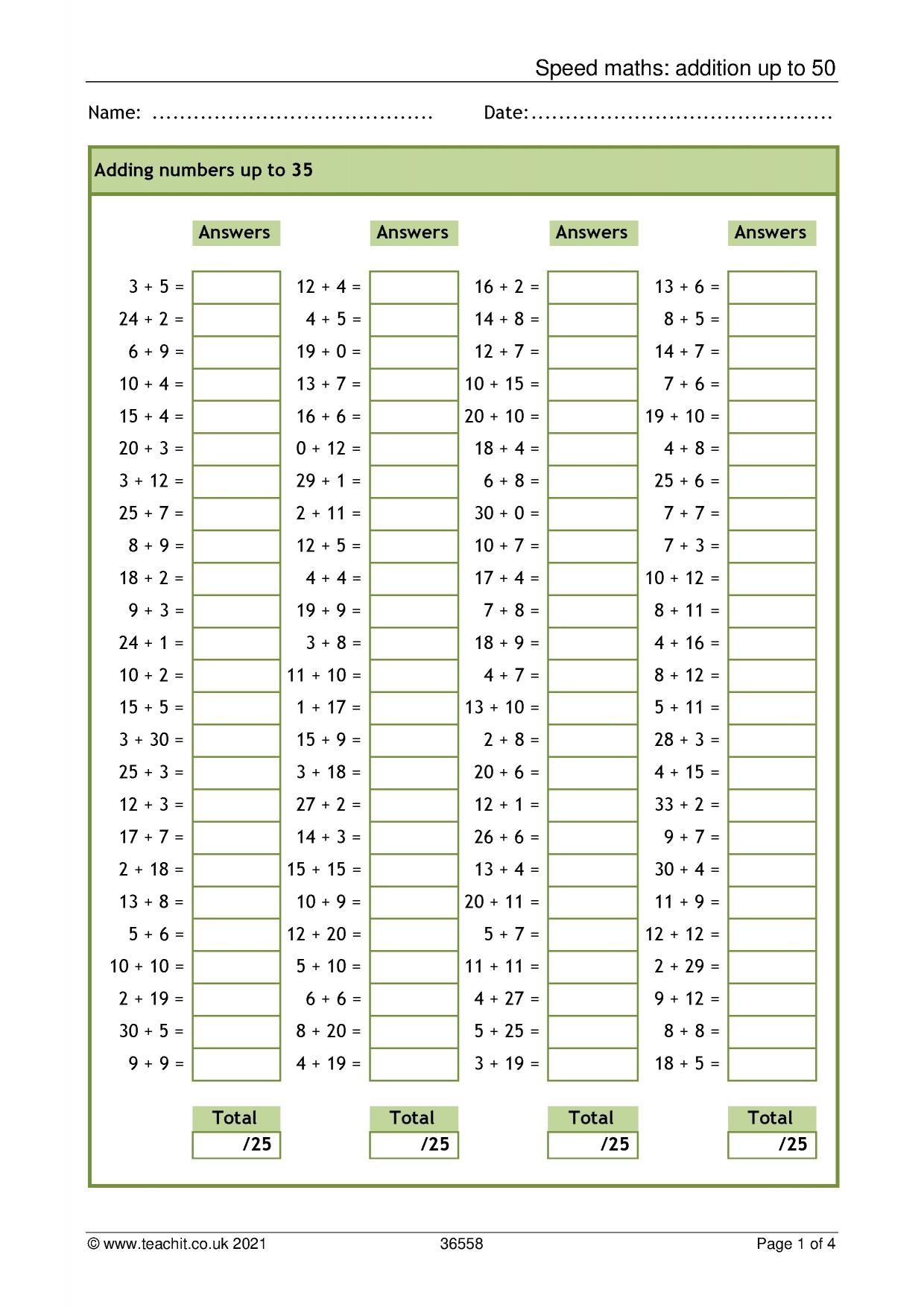 Speed Maths Addition Up To 50 Number KS2 Teachit Worksheets Library